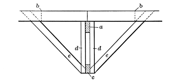 A side view of the frame, which is of such a character as to fully explain itself, is presented in Fig. 4. The plate is made of two 2 × 8 plank spiked together to form a trough and inverted over the tops of the posts. The manner of constructing the bents of the basement is indicated in Fig. 5. If the posts can stand on solid pillars of stone no sills are necessary, and the fillers extend down to the lower ends of the posts and up to the joist bearers. A side view of the purlin [Pg 13] plates, which are made of two 2 × 8 or 2 × 10 plank with a 2-inch space between them, is shown in Fig. 6. The coupling or splicing block extends either way from the roof support a to the dotted lines b b. At c is represented a sectional view of the sub-support, to which the stays d d are secured, and also the lower end of the braces e e. This arrangement gives sufficient strength to the purlin plates to sustain a slate or any other roof desired. Fig. 7 shows the manner in which the peak of the arch is constructed. The roof supports, which are usually of 2 × 8, are indicated by A A. The sub-supports, usually of 2 × 6 plank, are indicated by B B, while the dotted lines represent the collar beams, C, constructed of 2 × 12 inch plank, there being one on either side and bound together by ½-inch carriage bolts 6½ inches in length, their position being indicated by the small crosses.