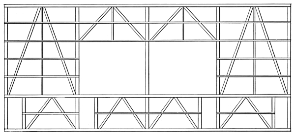 After 20 years’ experience in building barns without the cross beams it [Pg 32] would require peculiar conditions to induce us to use them, for they are continuously in the way, both when storing away hay or grain and when getting these out again for the thresher or for the feeding of stock. The upper portion of the frame submitted by “C. G.” does not show any braces, and we are at a loss to know if there is to be none, or if these were omitted because it is not that portion of the structure that is under consideration. Let me say, however, that that is one of the most prevalent mistakes in the construction of a barn. There are too few braces, and the first baby tornado that happens to pass that way will “lay it out in fine shape.” While we use plenty of braces, they are usually only 2 × 6 inches, and so do not take timber very rapidly. The geometrical triangle is the strongest figure one can secure, and it is with that idea always in mind that we do our barn work.