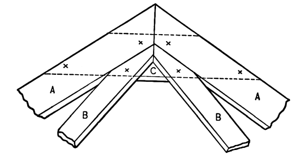 [Pg 9] At 16 16 the main plates, made of two 2 × 8 inch plank, are placed into a V-trough and inverted over the top of the post. The rafters 17 17 may be spliced on the purlin plates. The topmost intersections are bolted, as shown by means of the dots. The upper ends of the purlin posts are cut down 4 inches, on a line parallel with the roof supports, and again at right angles with the first cut, forming a saddle, into which are placed the purlin plates.