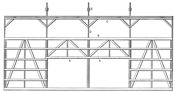 In Fig. 10 is shown a side view of a barn with two driveways and bay at either end. A A are duplicated on inside of posts, with bridge blocks at dotted lines; B´ is main plate; C is purlin plate of two 2 × 8 plank set at right angles with roof and also braced at right angles; D is roof supports, forming the arch of the barn, and E the collar beams. Fig. 11 shows interior bent of a “ground” barn with decks above driveway. Should stables be desired in one or both ends joist bearers may extend entire width of barn.