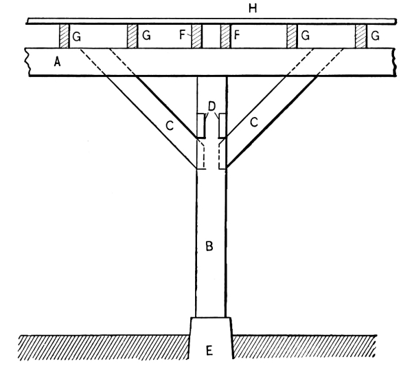 Three posts of the end bent, shown in Fig. 3, are constructed of two 2 × 8 plank, one 2 × 4 and one 3 × 6, all as indicated by the cross section in Fig. 8 of the engravings. [Pg 14]