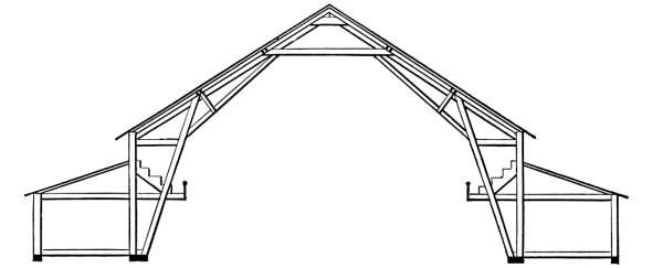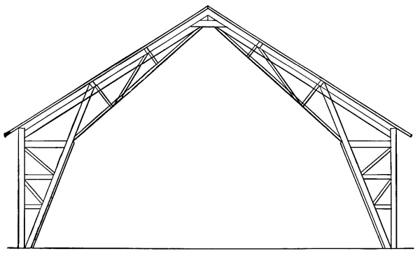 7. The full benefit of the self supporting arch roof, a construction of combined triangles, long braces and perpendicular timbers.