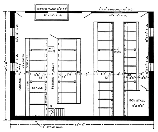 The floor plans submitted by “S. H.” are very good in design and arrangement, save that the hay chutes are made to appear directly over one of the main girders. Of course, this he would discover and rectify. Should it be difficult to obtain 8 × 8 stuff for posts and 8 × 10 for girders, the former may very easily be constructed of two 2 × 8’s and two 2 × 4’s, box pattern, thus saving something in materials and risk from dry rot. The girders might be made of two 4 × 10’s, or four 2 × 10’s, leaving an air space of 2 inches in the middle and saving the necessity of making mortises.
