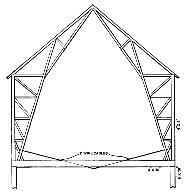 From John L. Shawver, Bellefontaine, Ohio.—Permit me to offer a substitute for the barn frame proposed by the correspondent “C. G.” of Vergennes, Vt., in the March issue of the paper. His timber trusses take up too much room, and at the same time the timbers are too expensive for this day and age. We place a little more timber in the joist bearer and prefer it in a different shape. He suggests 7 × 8 inches, and this would be 30 feet in length. We would use three 2 × 10’s, and could use any lengths to make the 30 feet; consequently our timbers could be purchased at much less cost. Instead of the 7 × 8 inch truss timbers we would use two wire cables [Pg 31] made of galvanized wire, seven strands, and doubled. While we would use a little heavier posts in the stables, the posts of the superstructure would contain only about one-half as much material, but this, too, we would prefer of different shape. In place of the 7 × 8 inch we would use two 2 × 8’s, and instead of the beam we would prefer the arch and the angling purlin posts, and thus have the interior entirely free from all timbers.