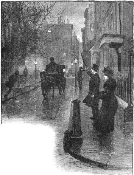 They had reached the crowded thoroughfare. Gaslights were flaring; the road was thronged with cabs and carts; the people were pushing along the pavement, too busy to notice the quiet couple, or to observe that the plain girl in an ulster had a white face, and that the lines of her mouth were set with pain and suffering. Across the street, in a few minutes, they were in a dreary square. Here there were no loiterers. A murky grey sky; black trees, flinging their gaunt arms to the chimney pots; rows of melancholy stone houses, with carved heads, placidly unconcerned, gazing down from the lintels.