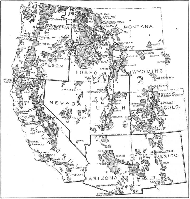 Map showing location of National Forests in the West