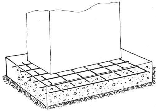 Full concrete or rock foundations are more expensive and more work to build but hard to beat for permanence. To construct them, dig a trench to the dimensions of your cabin but at least twice as wide as your finished foundation wall is to be and to solid ground below the frost line. Pour in a “footing” of concrete to a depth of 10 inches. This base will distribute the weight of the cabin. (Fig. 5.) On this footing build wooden form walls to the proper height—about one foot above ground level at the highest point of your grade is usual—and fill them up with the proper mixture of concrete. To prevent dry rot of the wood construction, air vents should be constructed at intervals in the concrete wall above grade. These should be covered with screening to keep small animals out. Thickness of foundation walls varies according to the weight of the building. A good rule is to make the top of the foundation two inches wider than the logs or timbers it is to support.