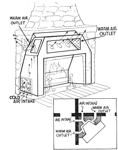 This diagram shows how the hot water tank can be connected with heating coils in the back of the fireplace or in the firebox of a wood-burning stove. A stand-by gas or oil heater supplies additional hot water when needed.