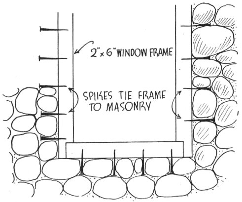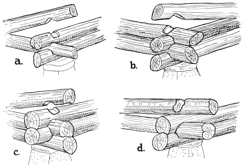 The sill logs or timbers are laid on top of the foundation. If your cabin is to be of logs, select a number of the strongest and straightest and lay them so as to form the outside “frame” of the cabin. They should be bolted tightly to the concrete by means of long iron bolts previously buried in the foundation walls. If the sills are to rest on piers or boulders, spike them together. The weight of the cabin will hold the sills in place. The 2×6 floor joists are cut in or notched over the sills. They should be set with the 2-inch side uppermost and securely spiked.
