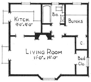 Increased floor area in the smaller cabin is obtained by setting the fireplace back flush with the walls. The chimney could have been set back still farther and covered, but running the stone work to the roof breaks up a long wall.