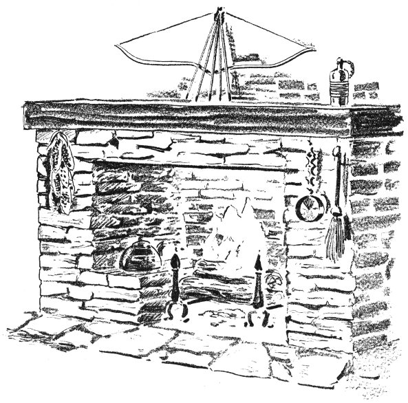 Here is an interesting treatment of massive stones that shows still another mantel arrangement. In this case the mantel is a quarter log supported by two heavy hewn beams imbedded in the masonry. It fits in charmingly with the atmosphere of a log cabin. The bar support for kettles is even more pioneerish than a pot and crane and in keeping with rugged charm of the fireplace itself.