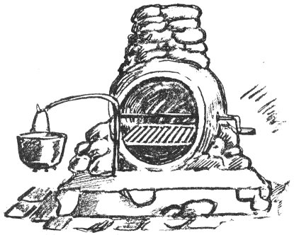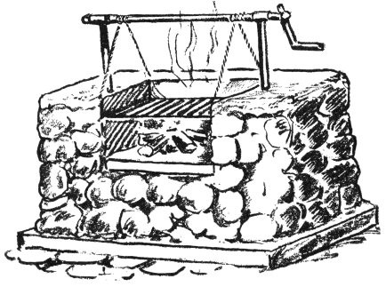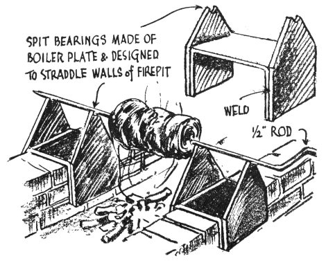 For roasts over the coals a revolving spit is indispensable. A half-inch iron bar can be bent in the form of a crank at one end, sharpened at the other, and set in a pair of bearings or saddles designed to straddle the walls of the firepit.