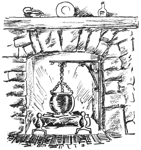 A pot and crane add interest to the cabin fireplace, whether it is indoors or out. Any wrought iron shop can make this crane. You might even get it done by the country blacksmith.