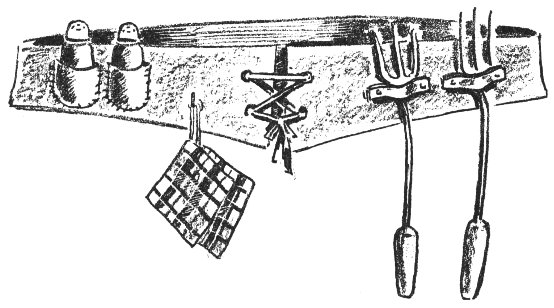 A barbecue belt is a great convenience in keeping important accessories handy when you are cooking in the open. You can make one of leather or oilcloth or several thicknesses of cotton material interlined with buckram. Make pockets to hold the salt and pepper shakers, provide clasps for your pot holders and loops to hold your fork and spoon. Now you are ready to cook. If you prefer, you can build these features into a chef’s apron.