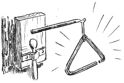 The old-fashioned California ranch-type dinner gong will round up the family from far and near when the meal is ready. Any blacksmith can forge one of octagonal tempered steel. Suspend it by a steel wire from a wrought iron bracket.