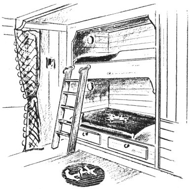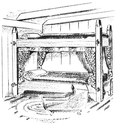 These bunks, attractively curtained with cretonne, fit into the atmosphere of the cabin living room without detracting from its appearance. If the curtains are made to slide closed, Pullman fashion, they provide privacy for an early retirer.