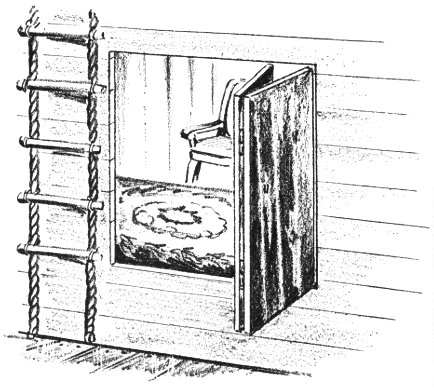 A small skylight trapdoor above your cabin cook stove serves as a ventilator and an escape for smoke and hot air. The drawing shows how it should be rigged. The box keeps out rain and snow and should be flashed all around with drain holes on the lower side.