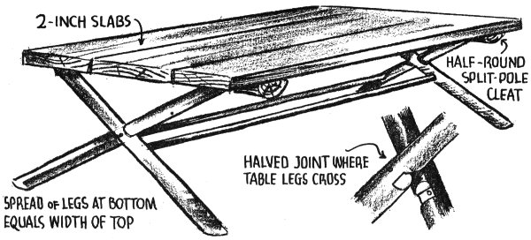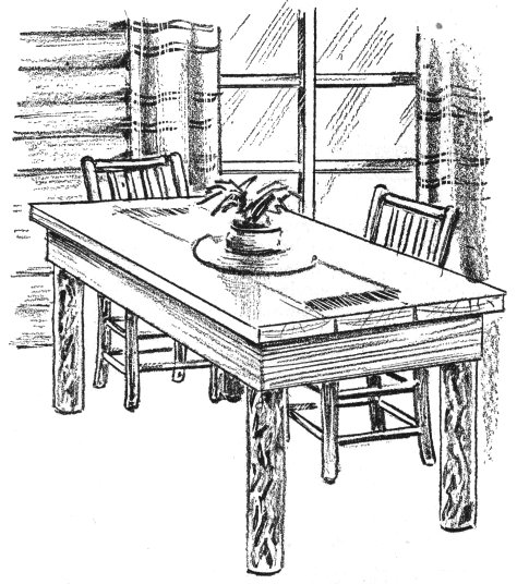 Here is a simple and sturdy cabin table that can be built in a few hours. Allow two linear feet of space for each person, and build the top of the table 29 inches from the floor.