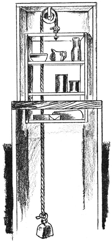 This “dummy waiter” type of underground cooler consists of a hole or well about 10 feet deep lined with concrete or bricks, with a frame over it to hold a series of shelves hung on a pulley with a counterbalance.