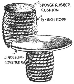 A rope-wound keg with sponge rubber cushion makes an unusual stool. A similar keg may also be used as a table base. Tack rope to hold in place.