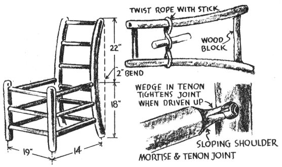 Steps in making traditional backwoods chairs. Seat and back can be woven of rawhide or covered with plywood and padded. If bending is not done when wood is green, steam wood in very hot water in covered trough.