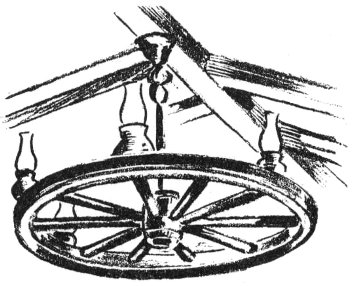 A chandelier made of an old wagon wheel and with the electric fixtures encased in old-fashioned lamps is an interesting and appropriate lighting fixture for the cabin living room.