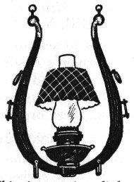 This interesting lighting fixture is made by suspending an old kerosene lamp on a hame from a discarded set of harness.