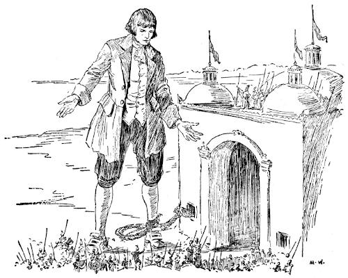 About four hours after we began our journey I awaked by a very ridiculous accident; for the carriage being stopped awhile, to adjust something that was out of order, two or three of the young natives had the curiosity to see how I looked when I was asleep; they climbed up into the engine, and, advancing very softly to my face, one of them, an officer in the guards, put the sharp end of his half-pike a good way up into my left nostril, which tickled my nose like a straw, and made[16] me sneeze violently; whereupon they stole off unperceived, and it was three weeks before I knew the cause of my awaking so suddenly. We made a long march the remaining part of that day, and rested at night with five hundred guards on each side of me, half with torches, and half with bows and arrows, ready to shoot me if I should offer to stir. The next morning at sunrise we continued our march, and arrived within two hundred yards of the city gates about noon. The emperor and all his court came out to meet us; but his great officers would by no means suffer his majesty to endanger his person by mounting on my body.