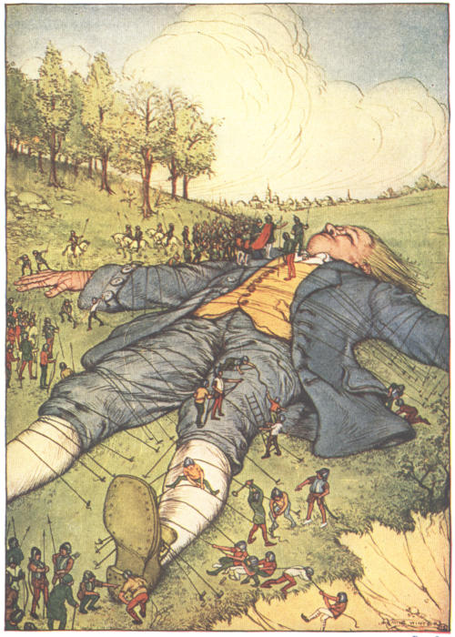 It would not be proper, for some reasons, to trouble the reader with the particulars of our adventures in those seas; let it suffice to inform him, that in our passage from thence to the East Indies, we were driven by a violent storm to the northwest of Van Diemen’s Land. By an observation, we found ourselves in the latitude of 30 degrees 2 minutes south. Twelve of our crew were dead by immoderate labor and ill food: the rest were in a very weak condition. On the 5th of November, which was the beginning of summer in those parts, the weather being very hazy, the seamen spied a rock within half a cable’s length of the ship, but the wind was so strong that we were driven directly upon it, and immediately split. Six of the crew, of whom I was one, having let down the boat into the sea, made a shift to get clear of the ship and the rock. We rowed, by my computation, about three leagues, till we were able to work no longer, being already spent with labor while we were in the ship. We therefore trusted ourselves to the mercy of the waves, and in about half an hour the boat was overset by a sudden flurry from the north. What became of my companions in the boat, as well as of those who escaped on the rock, or were left in the vessel, I cannot tell, but conclude they were all lost. For my own part, I swam as fortune directed me, and was pushed forward by wind and tide. I often let my legs drop, and could feel no bottom, but when I was almost gone, and able to struggle no longer, I found myself within my depth; and by this time the storm[8] was much abated. The declivity was so small, that I walked near a mile before I got to the shore, which I conjectured was about eight o’clock in the evening. I then advanced forward near half a mile, but could not discover any sign of houses or inhabitants; at least I was in so weak a condition that I did not observe them. I was extremely tired, and with that, and the heat of the weather, and about half a pint of brandy that I drank as I left the ship, I found myself much inclined to sleep. I lay down on the grass, which was very short and soft, where I slept sounder than ever I remember to have done in my life, and, as I reckoned, about nine hours; for when I awakened, it was just daylight. I attempted to rise, but was not able to stir; for, as I happened to lie on my back, I found my arms and legs were strongly fastened on each side to the ground; and my hair, which was long and thick, tied down in the same manner. I likewise felt several slender ligatures across my body, from my arm-pits to my thighs. I could only look upwards; the sun began to grow hot, and the light offended my eyes. I heard a confused noise about me; but in the posture I lay, could see nothing except the sky. In a little time, I felt something alive moving on my left leg, which advancing gently forward over my breast, came almost up to my chin; when, bending my eyes downwards as much as I could, I perceived it to be a human creature not six inches high, with a bow and an arrow in his hands and a quiver at his back. In the meantime I felt at least forty more of the same kind (as I conjectured) following the first. I was in the utmost astonishment, and roared so loud that they all ran back in a fright, and some of them, as I was afterwards told,[9] were hurt by the falls they got by leaping from my sides upon the ground. However, they soon returned, and one of them who ventured so far as to get a full sight of my face, lifting up his hands and eyes by way of admiration, cried out in a shrill but distinct voice, Hekinah degul! The others repeated the same words several times, but I then knew not what it meant. I lay all this while, as the reader may believe, in great uneasiness; at length, struggling to get loose, I had the fortune to break the strings, and wrench out the pegs that fastened my left arm to the ground, for, by lifting it up to my face, I discovered the methods they had taken to bind me, and at the same time with a violent pull, which gave me excessive pain, I a little loosened the strings that tied down my hair on the left side, so that I was just able to turn my head about two inches. But the creatures ran off a second time, before I could seize them; whereupon there was a great shout in a very shrill accent, and after it had ceased I heard one of them cry aloud, Tolgo phonac; when in an instant I felt above a hundred arrows discharged on my left hand, which pricked me like so many needles; and besides they shot another flight into the air, as we do bombs in Europe, whereof many, I suppose, fell on my body (though I felt them not) and some on my face, which I immediately covered with my left hand. When this shower of arrows was over, I fell a-groaning with grief and pain, and then striving again to get loose, they discharged another volley larger than the first, and some of them attempted with spears to stick me in the sides; but by good luck I had on me a buff jerkin, which they could not pierce. I thought it the most prudent method to[10] lie still, and my design was to continue so till night, when, my left hand being already loose, I could easily free myself: and as for the inhabitants, I had reason to believe I might be a match for the greatest army they could bring against me, if they were all of the same size with him that I saw. But fortune disposed otherwise of me. When the people observed I was quiet, they discharged no more arrows; but, by the noise I heard, I knew their numbers increased; and about four yards from me, over against my right ear, I heard a knocking for above an hour, like that of people at work; when turning my head that way, as well as the pegs and strings would permit me, I saw a stage erected about a foot and a half from the ground, capable of holding four of the inhabitants, with two or three ladders to mount it: whence one of them, who seemed to be a person of quality, made me a long speech, whereof I understood not a syllable. But I should