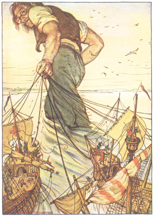 I then made another sign that I wanted drink. They found by my eating that a small quantity would not suffice me; and being a most ingenious people, they slung up, with great dexterity, one of their largest hogsheads, then rolled it towards my hand, and beat out the top; I drank it off at a draught, which I might well do, for it did not hold half a pint, and tasted like a small wine of[12] Burgundy, but much more delicious. They brought me a second hogshead, which I drank in the same manner, and made signs for more: but they had none to give me. When I had performed these wonders they shouted for joy, and danced upon my breast, repeating several times as they did at first, Hekinah degul. They made me a sign that I should throw down the two hogsheads, but first warned the people below to stand out of the way, crying aloud, Borach mevola: and when they saw the vessels in the air there was a universal shout of Hekinah degul. I confess I was often tempted, while they were passing backwards and forwards on my body, to seize forty or fifty of the first that came in my reach and dash them against the ground. But the remembrance of what I had felt, which probably might not be the worst they could do, and the promise of honor I made to them—for so I interpreted my submissive behavior—soon drove out these imaginations. Besides, I now considered myself as bound by the laws of hospitality to a people who had treated me with so much expense and magnificence. However, in my thoughts I could not sufficiently wonder at the intrepidity of these diminutive mortals, who durst venture to mount and walk upon my body while one of my hands was at liberty, without trembling at the very sight of so prodigious a creature as I must appear to them. After some time, when they observed that I made no more demands for meat, there appeared before me a person of high rank from his imperial majesty. His excellency, having mounted on the small of my right leg, advanced forwards up to my face, with about a dozen of his retinue, and producing his credentials under the signet royal, which he applied close to my eyes, spoke[13] about ten minutes without any signs of anger, but with a kind of determinate resolution: often pointing forwards, which, as I afterwards found, was towards the capital city, about half a mile distant, whither it was agreed by his majesty in council that I must be conveyed. I answered in few words, but to no purpose, and made a sign with my hand that was loose, putting it to the other (but over his excellency’s head for fear of hurting him or his train), and then to my own head and body, to signify that I desired my liberty. It appeared that he understood me well enough, for he shook his head by way of disapprobation, and held his hands in a posture to show that I must be carried as a prisoner. However, he made other signs, to let me understand that I should have meat and drink enough, and very good treatment. Whereupon I once more thought of attempting to break my bonds; but again, when I felt the smart of their arrows upon my face and hands, which were all in blisters, and many of the darts still sticking in them, and observing likewise that the number of my enemies increased, I gave tokens to let them know that they might do with me what they pleased. Upon this the hurgo and his train withdrew, with much civility and cheerful countenances. Soon after I heard a general shout, with frequent repetitions of the words, peplom selan; and I felt great numbers of people on my left side relaxing the cords to such a degree that I was able to turn upon my right. But, before this, they had daubed my face and both my hands with a sort of ointment, very pleasant to the smell, which in a few minutes removed all the smart of their arrows. These circumstances, added to the refreshment I had received by their victuals[14] and drink, which were very nourishing, disposed me to sleep. I slept about eight hours, as I was afterwards assured; and it was no wonder, for the physicians, by the emperor’s order, had mingled a sleepy potion in the hogsheads of wine.