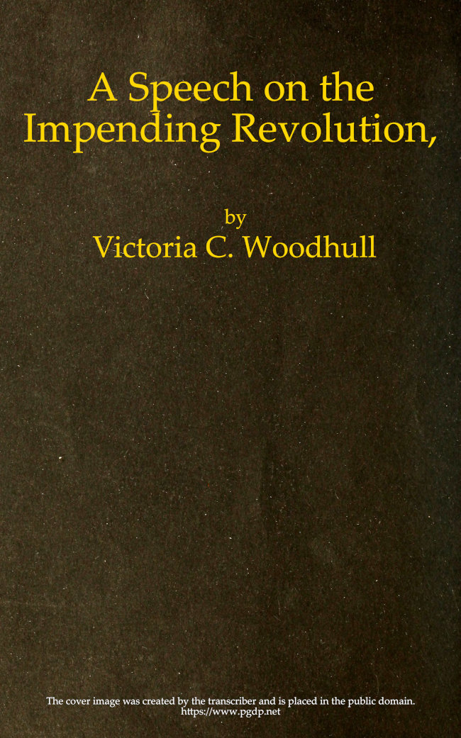 In conclusion, therefore, let me urge every soul who desires to be truly Christian to no longer separate Christianity from politics, but to make it the base upon which to build the future political structure. Instead of an amendment to the Constitution, which these hypocrites desire, recognizing a God who is simply the Father of themselves, and a Christ of whom they are the self-appointed representatives, give us a new Constitution, recognizing the human rights of the people to govern themselves, of which they cannot be robbed under any pretext whatever, and my word for it, humanity will not be slow to render due homage to their God. Let that Constitution give a place to every branch of reform, while it shall not so much as militate against the rights of a single individual in the whole world—and we are large enough to begin to say the whole world—and to think of and prepare the way for the time when all nations, kindred and tongues shall be united in a universal government, and the Constitution of the United States of the World be the