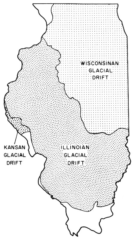 Most of this material, called glacial drift, was brought in by the ice during the last two of the four major periods of glaciation—the Illinoian period 100,000 to 150,000 years ago and the Wisconsinan 5,000 to 50,000 years ago. The older drift introduced during the Kansan and Nebraskan glacial periods is almost entirely buried beneath the later drifts.