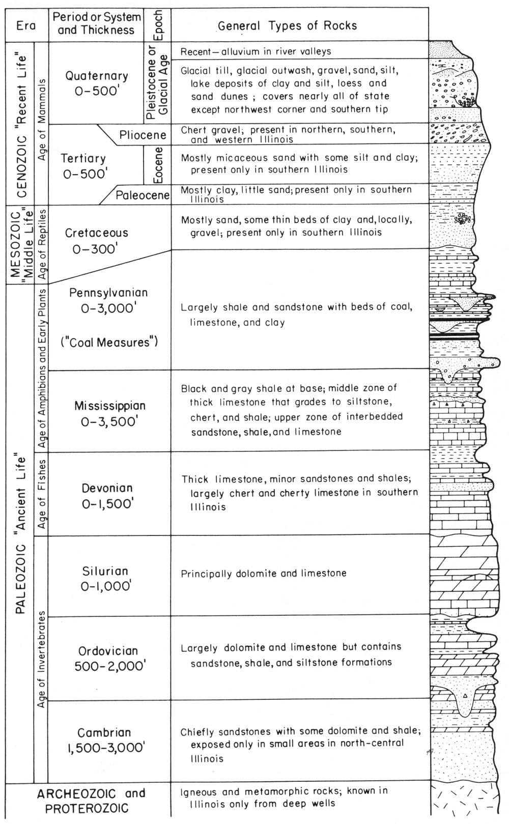 Figure 2—Diagram of layers of rocks in Illinois. The oldest rocks are at the bottom, the youngest at the top. Names are the standard ones applied by geologists to the subdivisions of the geologic eras.