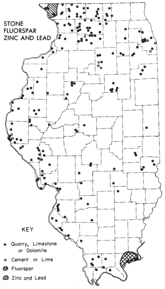 Minerals produced commercially in Illinois include crude oil, coal, limestone, dolomite, clay, sand, gravel, fluorspar, tripoli, ganister, novaculite gravel, silica sand, and the metals zinc and lead. The distribution of mineral industries, shown in the several maps of figures 8 through 12, is, of course, related to the distribution of the rocks (plate 1). For example, the coal mines are scattered along the margin of the area of Pennsylvanian rocks where the coals are at relatively shallow depths.