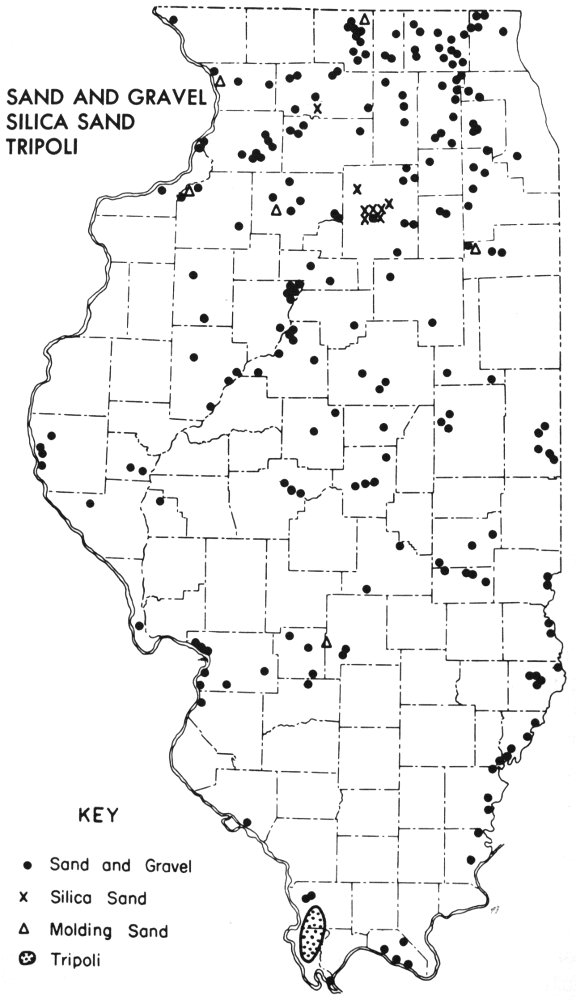 Figure 12—Sand and gravel is produced at many places in the state. Silica sand is produced only from a sandstone in northern Illinois. Tripoli is found only in southern Illinois.