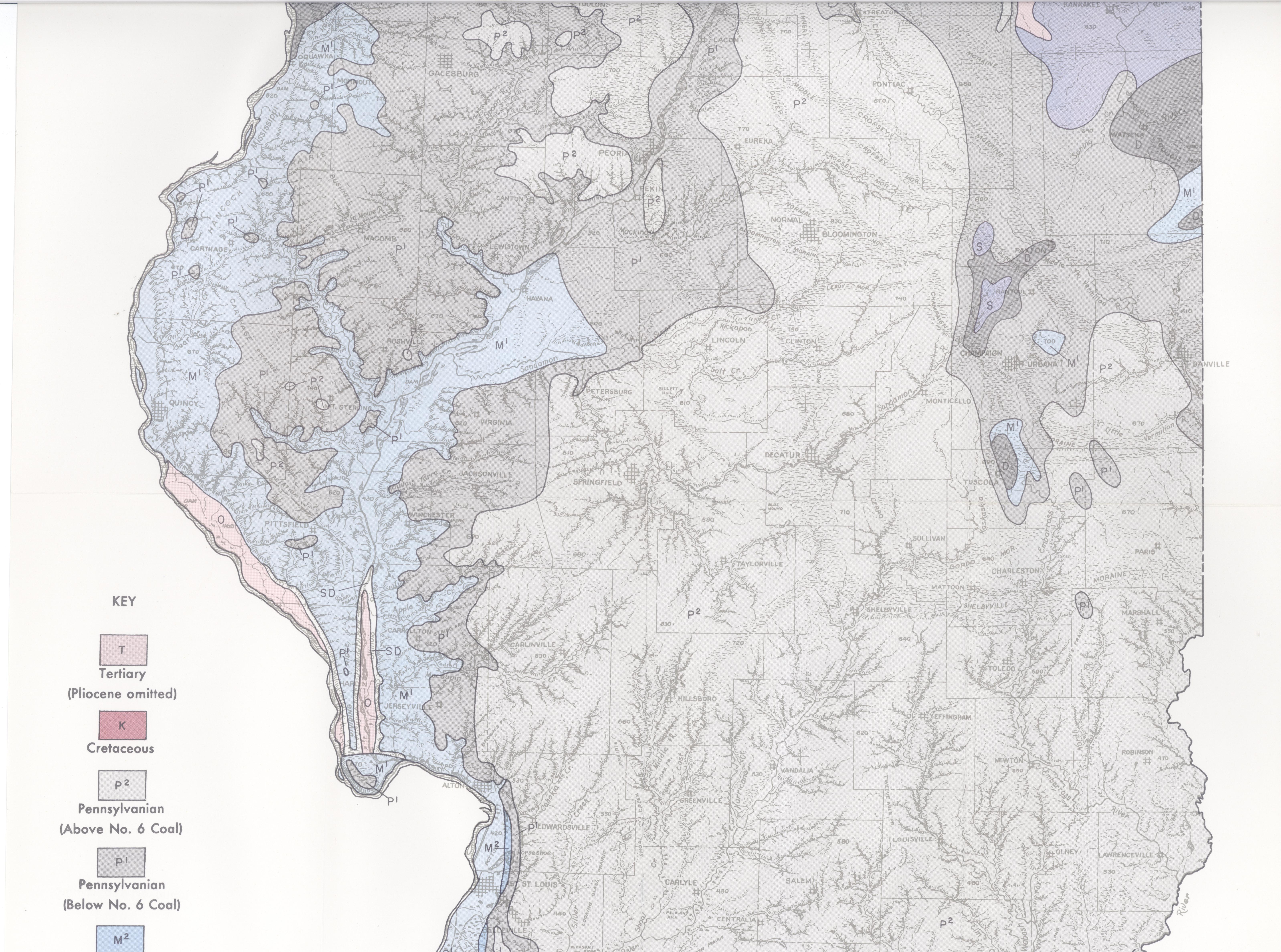 The Pennsylvanian System is divided into two areas on the map (P¹ and P²). The rocks shown in lightest gray (P²) lie above the No. 6 Coal in the sequence and those in medium gray (P¹) lie below it. The No. 6 Coal is one of the thickest, most valuable coals in the state. Pennsylvanian rocks occur under the glacial drift, and their thickness ranges from a few feet to as much as 3,000 feet.