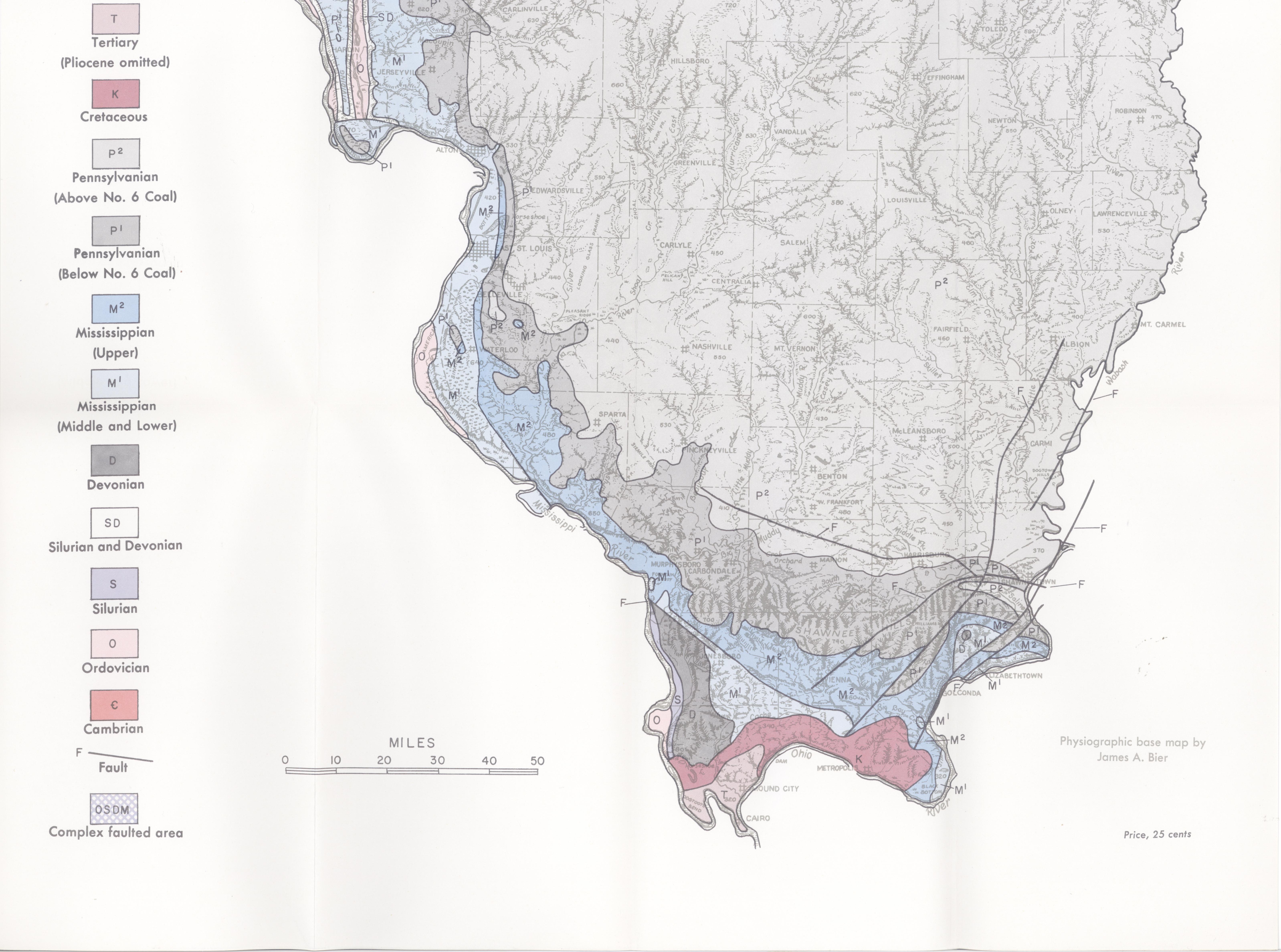 As shown on the generalized rock column in figure 2, the rocks next older than the glacial drift (Pleistocene) are the Tertiary and Cretaceous sands, gravels, and clays, mostly unconsolidated. They occur only at the extreme southern tip of Illinois and were deposited when that area was covered by a northward extension of the Gulf of Mexico. The Tertiary rocks are shown on the map in grayed pink (T) and the Cretaceous in red-violet (K).
