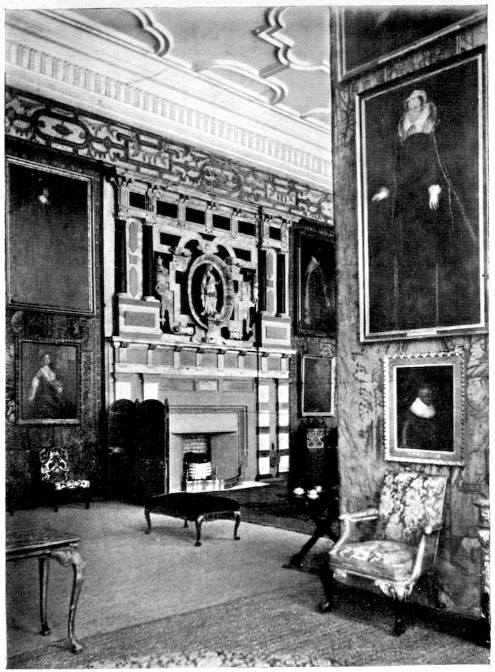 This legend is to be faintly traced in the interior of the ruined old hall. With the exception of the Shrewsbury coronet and the initials, you find very little suggestion of the Talbots. Everywhere the arms of Hardwick predominate in panel, fireplace, and lock. They strike the eye the instant you enter the house by the great entrance-hall. Large and magnificent, they are set forth on the right wall: in heraldic language, “a saltire engrailed azure; on a chief of the second three cinquefoils of the field,” set in a lozenge-shaped shield and bearing the aforesaid coronet. The supporters are two “stags proper, each gorged with a chaplet of roses, argent, between two bars azure.” To these supporters the lady had no right because her family had none. But she assumed them, turning to account the stag of her family crest. Her son William adopted a variation of this, and in the Devonshire arms of to-day we again find the wreathed stags proper, while the shield bears three harts’ heads. In the Mary Queen of Scots bedroom you will find in plaster work again the Hardwick arms, but also those of Cavendish and of the Countess’s mother, Elizabeth Leake. Needless to say, the house is built in the grand manner. The great entrance-hall runs to the height of two stories, and besides its panelling and old furniture has screens of tapestry. Just off the stairway on the left is the curious little chapel shut off from the landing by an open-work oak 360screen. Close by is a state bedroom, and adjoining it is a fine dining-room, whence a minstrels’ gallery leads to the wainscoted and tapestried drawing-room. The splendid presence-chamber, sixty-five feet long, thirty-three wide, and twenty-six high, is another remarkable feature, and besides its pictures and tapestry has the famous ancient frieze, already mentioned, in coloured plaster relief representing the Court of Diana. The choice of theme was, no doubt, out of compliment to the Queen, for her initials and arms are in this room substituted for those of the Countess, who, in spite of her dreams, never had the delight of receiving Elizabeth here.