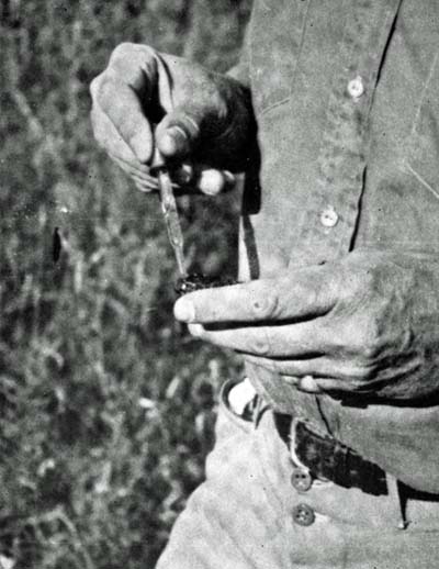 In order to time a bee it is necessary to be able to identify an individual. George Smith used to do this by extracting some seed or pollen from the bud of a small mossy plant and sprinkling a little of the green dust on the back of a bee. At best it was an uncertain process as the dust was liable to be blown off before the bee’s return, and even if not, was hard to see. I have evolved a simpler and better system. To our equipment as already described, let us add a small bottle of water, a tiny camel’s hair brush, and a piece of blue carpenter’s chalk. With the blade of a penknife, scrape some dust from the chalk onto the back of a smooth stone or the blade of a hand axe if you carry one. Incidentally a small scout’s axe is a handy thing to have for clearing[21] brush, making stands, marking the bee tree when you have found it, and blazing a trail from it if it is deep in the woods and should be hard to find again. On the chalk dust, with the brush, drop a few drops of water and stir till the water is coloured blue. Then with the wet brush dab the rear of a loading bee. This must be done deftly and gently. Bees do not like to be painted. A good hunter can guess which bee is apt to be unreasonably phlegmatic and, especially if one is loading from a half empty cell, with the shoulders buried and his tail raised, he can be painted without disturbing him. Once daubed, the new decoration does not annoy him in the least and is not noticed by his fellows. When wet, the spot shows only slightly, but by the time the bee returns, the chalk dust will be dry and will stand out like a beacon so vivid that it can be spotted even before the bee alights. We now have an identifiable bee and can time him.