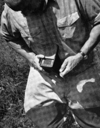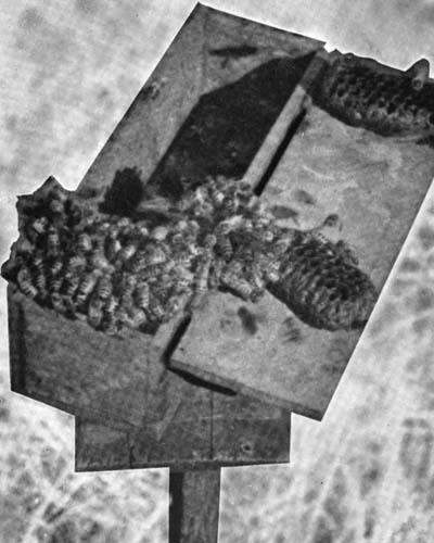 Now it is time to move. One might ask why, knowing the direction and the approximate distance, one does not immediately hunt for the tree. The answer is that there are ten thousand trees in the woods and only one the bee tree. One can never be sure of the exact line or, with any exactitude, the distance. Sometimes when one has narrowed the problem to an area of a hundred yards square, it is hard to find the tree. So once more the bee box is placed on the[22] stand, a loaded comb dropped into the front compartment and the lid left open. The spare comb should be hidden carefully. Great ire on the part of the bees. They again become suspicious and do not want to enter the box. As more arrive, the air is filled with a disgusted humming. In time the temptation is too great and one after another a bee drops down to the comb. When ten or a dozen have done so, snap down the lid of the box and drive them into the rear compartment as before. They are reluctant to go, but a puff of cigarette smoke blown through a crack in the lid will send them scurrying to the rear in search of purer air. Close the slide, reopen the box, place it on the stand and catch another lot. Catch all you can. Then pull up the stand, gather up your paraphernalia and move three or four hundred yards down the line. Then set up the stand and release the bees in batches of eight or ten.