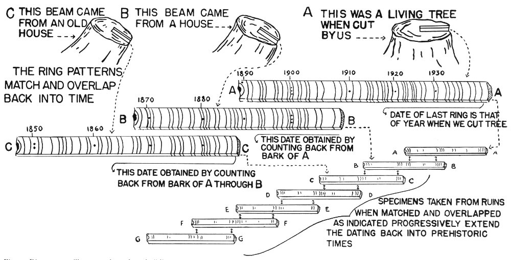Fortunately, through the study of living trees, Dr. Douglass had learned that the tree-rings over a period of years formed a distinct pattern which could be recognized when found on most conifers. Next he began to search for trees which had been cut perhaps many years before, but which contained a pattern which fitted some early portion of that tree whose cutting date was known. This led him to beams made from whole logs which have been a characteristic feature of Southwestern architecture for many centuries. By finding old beams whose outer rings formed the same pattern as the inner rings of living trees the known chronology was increased. Through correlating the patterns of progressively older trees with younger ones the pattern was finally established for the period between 1280 and 1929.