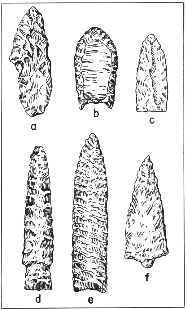 Fig. 3—Projectile points of the most ancient cultures. a. Sandia, b. Folsom, c. San Jon, d. Eden Yuma, e. Oblique Yuma, f. Gypsum Cave.