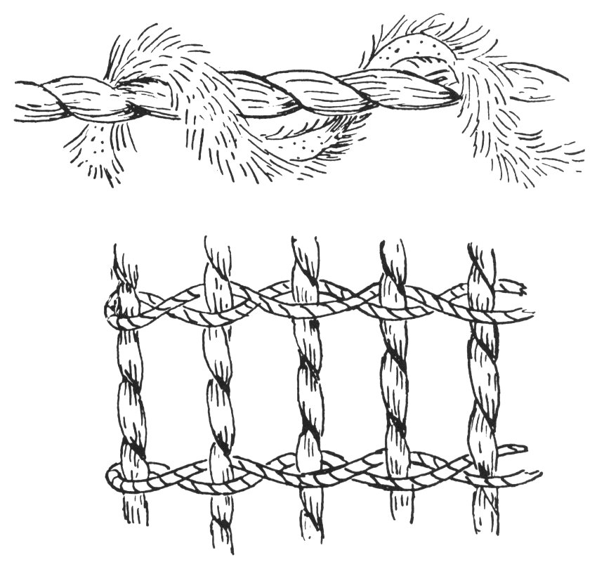 Diagram showing the method of making a fur-cloth blanket. The upper figure shows the construction of a fur strip; the lower shows the manner in which the strips were held together.