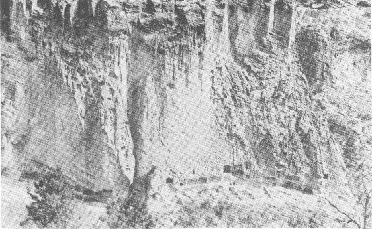 Unusual cliff-ruins and open sites in beautiful Frijoles Canyon, in the Pajarito Plateau, west of Santa Fe and south of Los Alamos, New Mexico, seventeen miles from paved highway. Museum. Small lodge open May-October.