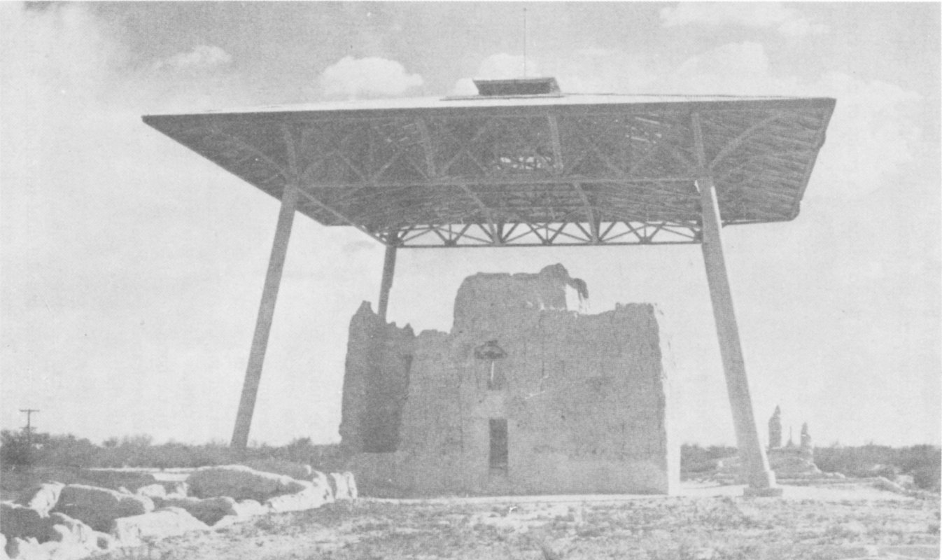 Ruins of the pueblo and mission of Humanas, abandoned about 1675. No museum; no accommodations. By a poor road twenty-five miles south of Mountainair, New Mexico, which is on Highway U. S.-60.