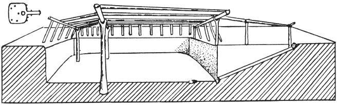 “The house floors ranged in diameter from eight to thirty feet. They were saucer-shaped, formed of adobe mud not too smoothly spread over the surface of the excavation. The rim of the saucer was plastered against a series of short horizontal foot logs, laid to conform to the arc of the circle. These served as the foundation of the wall, the construction of which may be characterized as wood-and-mud masonry. Sticks and small timbers were laid around horizontally, and the interstices were crammed full of adobe to produce a strong, tough shell. The wall leaned somewhat inward as it rose to a convenient head height. Roofs were cribbed. Since the roof rested directly on the wall there was no necessity for stout vertical supporting timbers such as have been found in dwellings of the succeeding period.