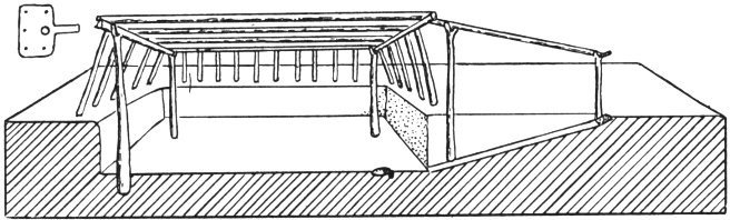 Even before these discoveries were made it had been known that the Basketmakers had some knowledge of construction. In the caves or shelters they built cists which provided storage space for corn and which often served a secondary purpose as a final resting place for the dead. Some were lined with grass and bark and may have been used as temporary sleeping places. The cists were oval or circular pits, usually dug in the cave floor. The average diameter was between three and five feet and the average depth about two feet. There were also larger cists which reached a diameter of over eight feet and were four feet deep. Some were divided into bins by slab partitions. Cists were sometimes simply pits but in other cases they were lined with stone slabs and reinforced with adobe. Covers were usually provided. For the smaller cists they were normally only sandstone slabs. The larger cists often had more elaborate roofs of wood and plaster and some even had above-ground superstructures of poles, brush, and bark, sometimes capped by adobe.