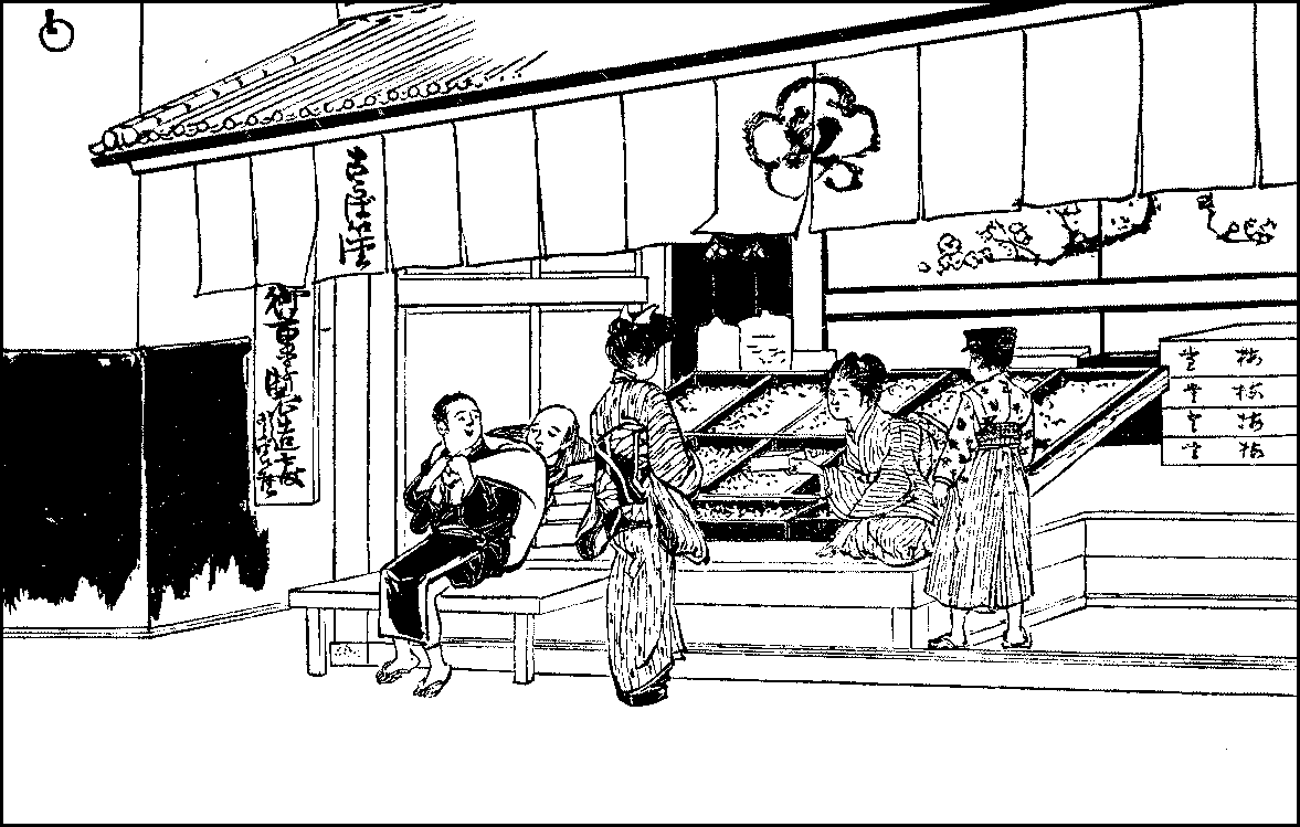 Japanese diet—Vegetables—Sea-weeds and flowers—Fish—Shell-fish—Crabs and other molluscs—Fowl—Meat—Prepared food—Peculiarities of food—Fruits—The bever—Baked potatoes and cracknel—Confectionery—Reasons for its abundance—Sponge-cake—Glutinous rice and red bean—Kinds of confectionery—Sugar in Japanese confectionery.