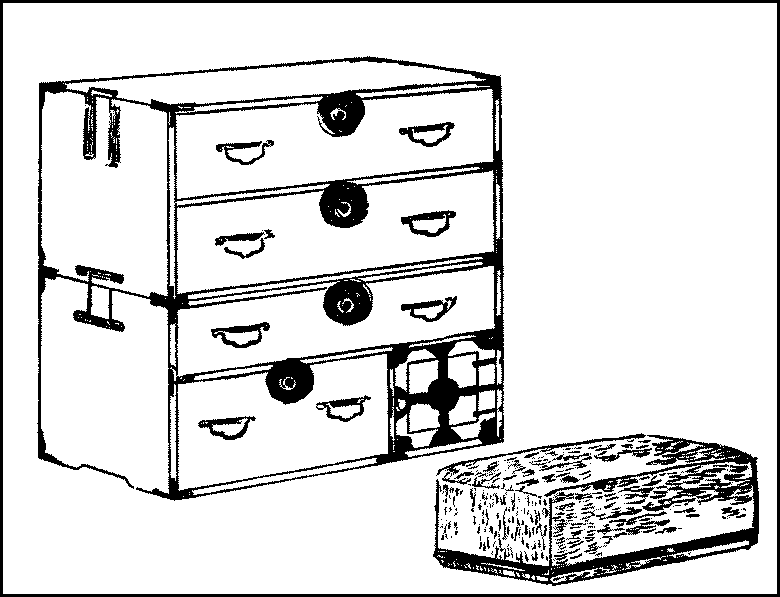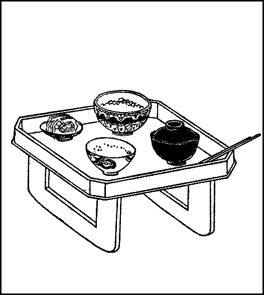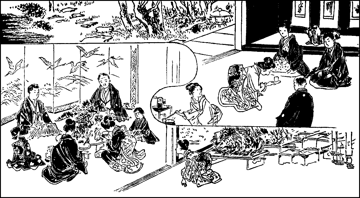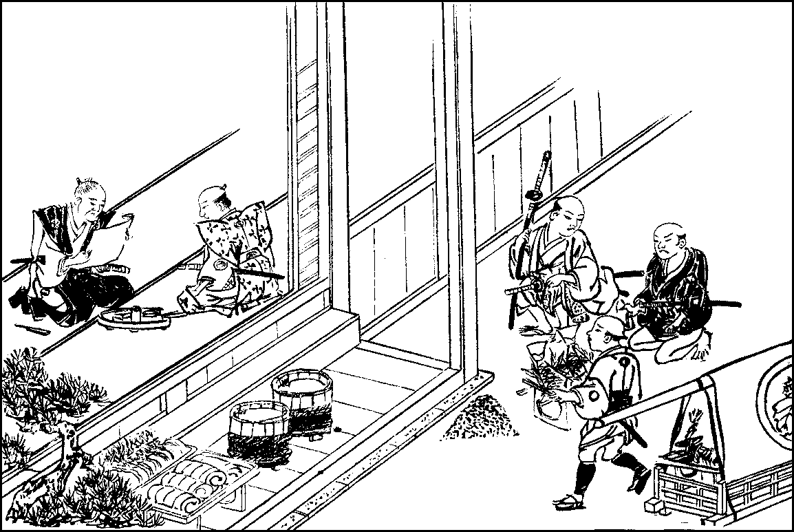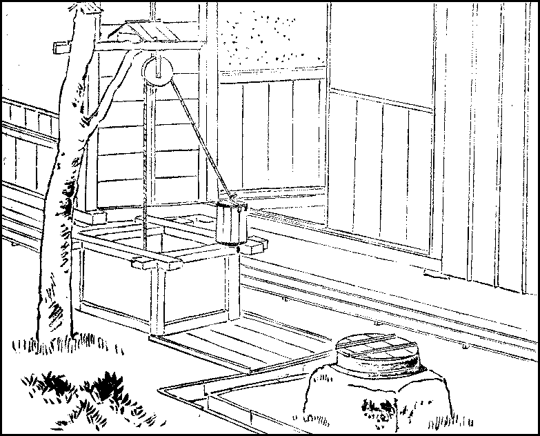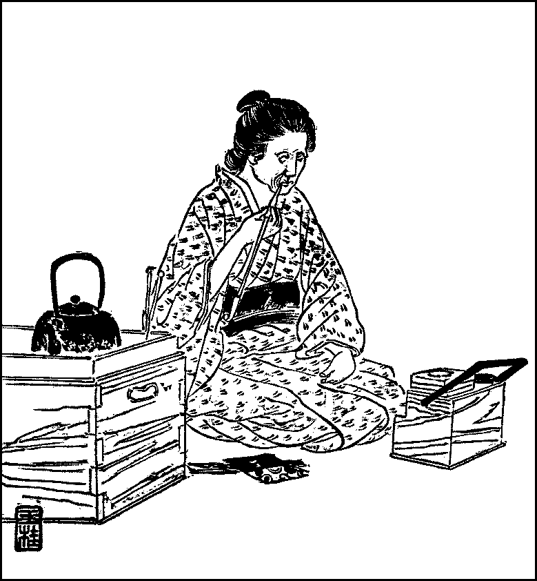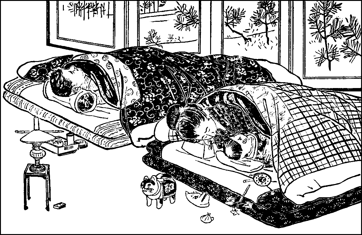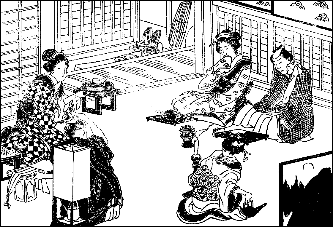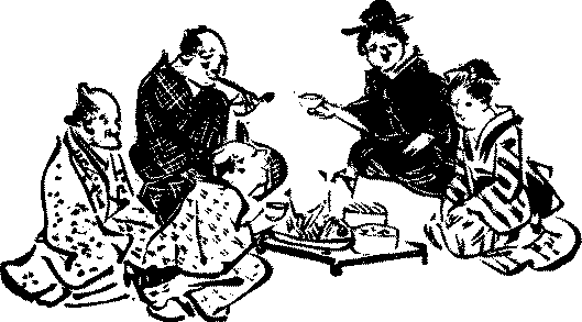 Rice—Sake—Wheat and barley—Soy sauce—Mirin—Rice-cooking—Soap—Pickled vegetables—Meal trays—Chopsticks—Breakfast—Clearing and washing—The kitchen—The little hearth—Pots and pans—Other utensils—Boxes and casks—Shelves—The sink and water-supply—The midday meal—The evening meal—Sake-drinking.