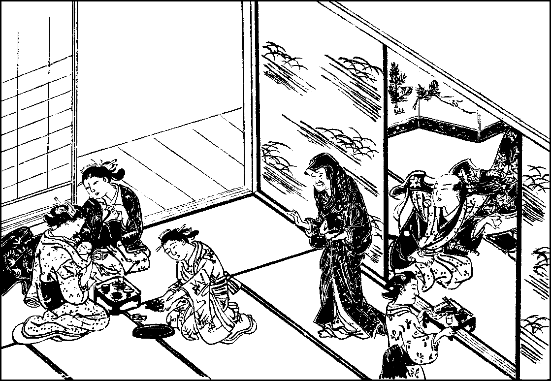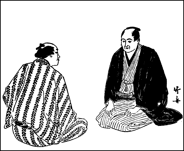 Thus, playgoing is expensive and takes up the best part of a day, while the wrestling matches which arouse universal interest occur but twice a year, other matches being mostly of local interest only. Neither of these amusements can serve to while away a few hours of idleness or relaxation; to those who wish to spend an evening pleasantly and at little expense, the story-tellers’ hall is always open. It stands conspicuously in a street; for over a wide entrance, the walls of which are studded with numerous pegs for suspending the clogs and sandals of its patrons, hangs a large square lantern announcing on its face the names of the principal performers, while the name of the hall is inscribed at a side-end. The hall itself is a great matted room with a platform at the furthest end. The spectators squat promiscuously on the mats and watch the performances or listen to the tales of the story-teller on the platform which is about four feet high and can be seen from all parts of the room. The hall opens at six or half-past; but it only begins to fill an hour later and closes at about ten o’clock.